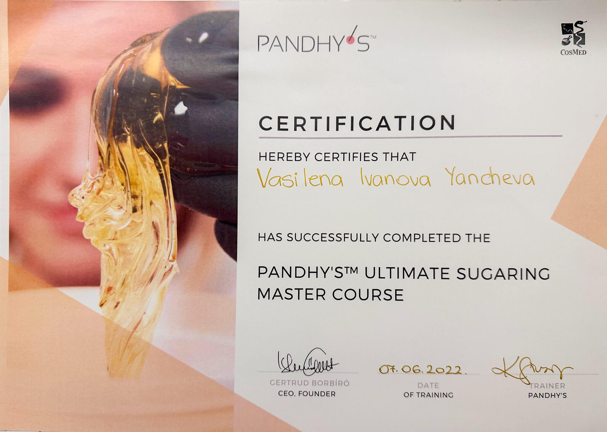 Убедени в потенциала на този метод, преминахме професионално обучение по шугаринг в Унгария, в една от най-известните и утвърдени компании за производство на захарна паста – Pandhy’s. Там усвоихме правилните техники, тънкости и професионални стандарти за работа.